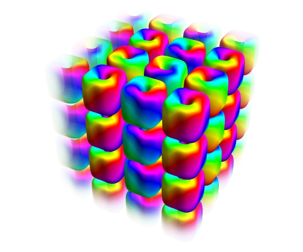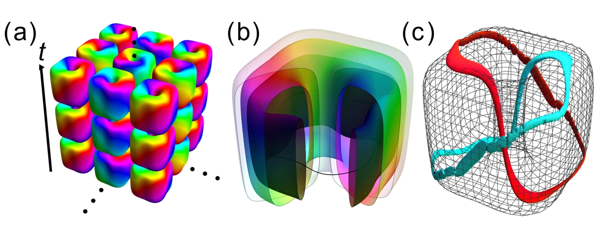 ホプフィオン[用語1]は、近年理論的に予測されている、非自明な3次元トポロジカル[用語2]構造です。実際に固体や電磁波などのいくつかの物理系で観測されており、高密度かつ安定にデータを保存・転送できる媒体として注目を集めています。そうした工学的な応用を広げるにはホプフィオンの結晶状態の発見が不可欠ですが、ホプフィオンが高密度で並ぶ周期構造は今までどの物理系でも発見されていませんでした。